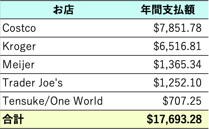 Costcoの中には、衝動買いしてしまったスイッチ2だったり、おしり拭きとかキッチンペーパーとかも入ってるので純粋に食費とは言えないけど、米やドリンクをサブスク購入しているAmazonの年間購入額がその米を含めて$8,054という壊滅的な数字になっていたので、食費に年間$18,000くらいかけてる、と言ってもおかしくはないだろう。つまり$1,500/月。