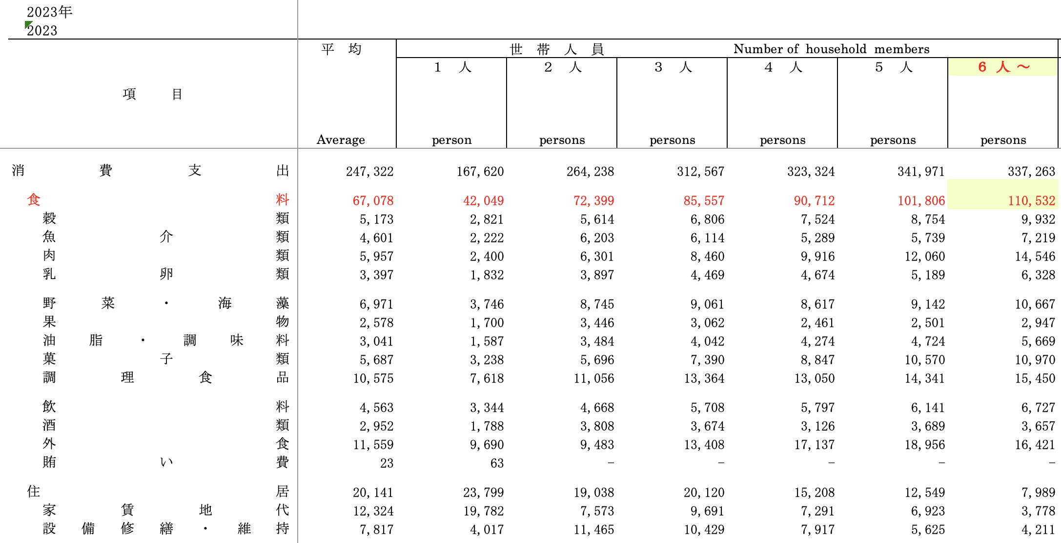 為替を150円で見たとして、1ヶ月の食費は225,000円。6人家族だから1人あたりだいたい37,500円。外食はあんまりしないので、プラスアルファで一声4万円くらいだろうか。これはどうなのか。