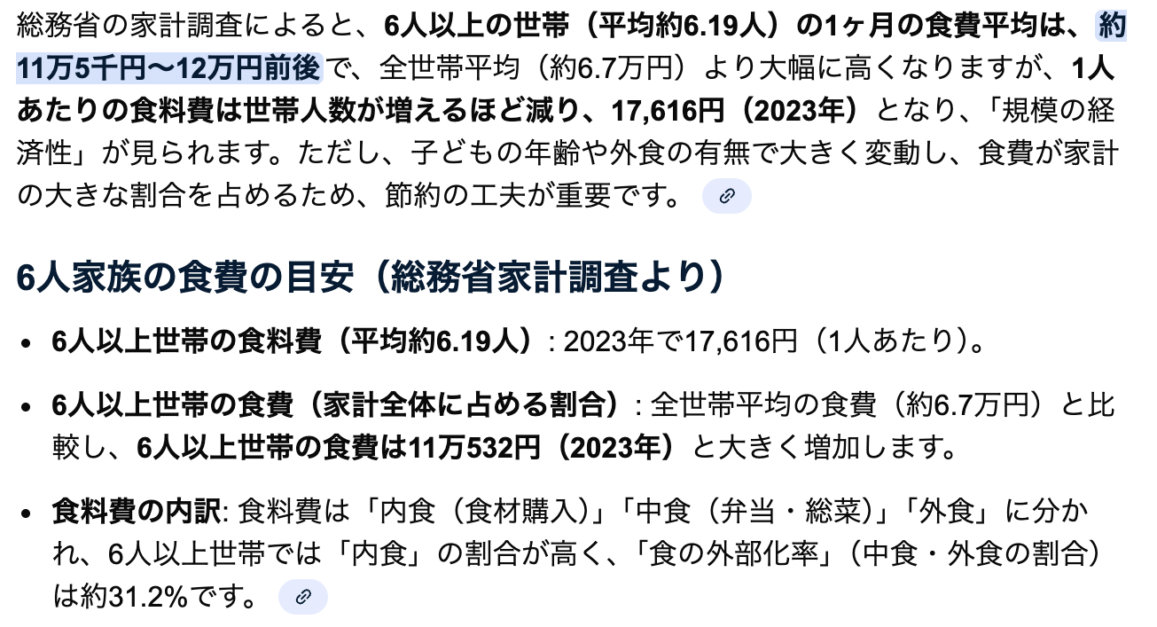 グーグル先生に聞いてみた所、日本における6人家族の1ヶ月の食費平均は12万円前後だと言う。